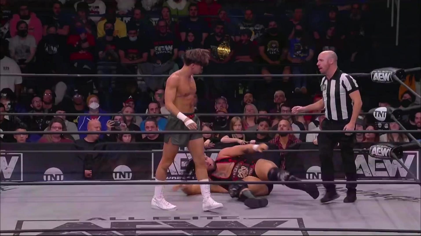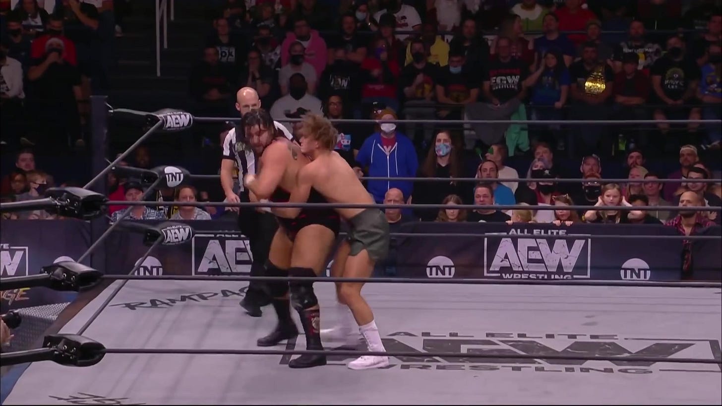 I’d also like to draw attention to the third character in this match: the referee. The ref is more than just there to count the pinfall and sell the illusion of a real fight, he also keeps time (since each match is given a certain amount of show to occupy), legitimately watches for the wrestlers’ health, smooths over any issues that occur (such as an object where it shouldn’t be), and sometimes gets involved in the storyline of the match (most common is the “ref bump”, where the referee gets taken out so there’s no one to count the pinfall). The best referees do forty things at once without ever drawing attention to themselves, and in my opinion referee Bryce Remsburg is one of the best to ever do it.