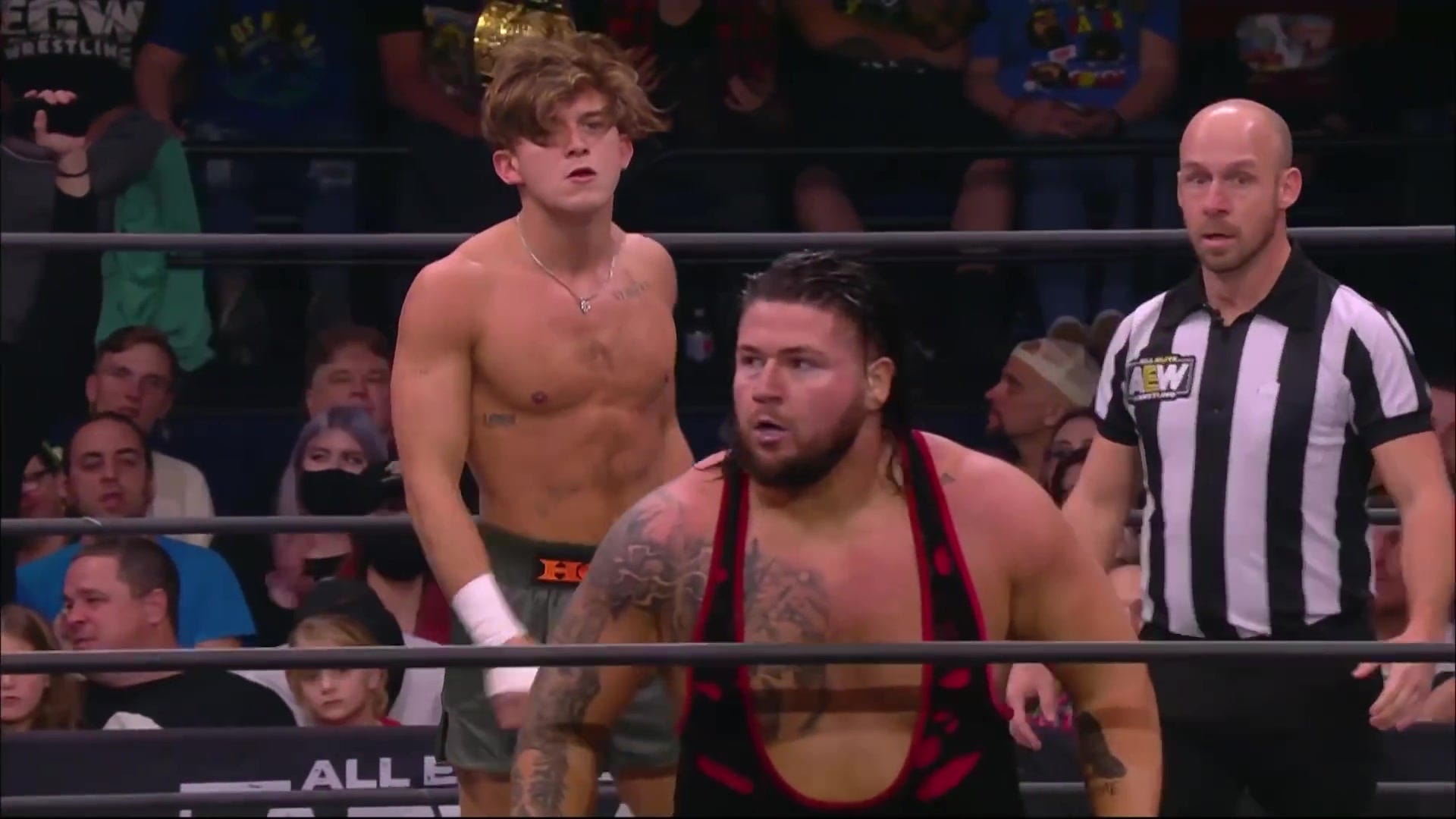 All you need to know is that this is Hook’s (the smaller guy with the Flock of Seagulls hair and MMA trunks) second match ever. He has a huge amount of hype behind him for being the son of a famous wrestler named Taz 1 (Hook even does many of the same moves as his father.) Hook’s first match was hugely impressive, getting a ton of attention and praise from the wrestling side of the internet.